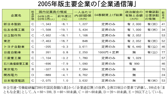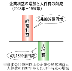 | ●憲法改悪NO! 競争より公正な社会を 《05春闘討論集会討議資料》 「もう一つの日本は可能だ!」。12月3・4日に開催された全労連・05年春闘討論集会は、「戦争をする国」づくりと、「官から民へ」の公共サービスの商品化を進める小泉「構造改革」に対し、「安心・平等・平和な社会」づくりをめざすとりくみが論議されました。国公労連は、全労連春闘の一翼を担い、産別要求を積極的に掲げて「地域からのたたかい」への結集を強めます。 ◇大企業の社会的責任を追及 「上場企業、9月中間経常益32%増」(「日経新聞」04年11月5日付)、大企業は史上空前の儲けをあげ続けています。 「民間給与6年連続減少」(国税庁「民間給与実態調査平成15年版」)、労働者の生活は、さらに悪化しています。大企業は経常利益を、リストラ「合理化」で確保しているのが実際だからです(下図参照)。 ![]() 大企業は、「社会的責任(CSR)を果たせ!」の声が高まっています。三菱自動車、コクド、三井物産等々、04年も、最低のルールさえ守らない大企業の不祥事が続発しました。 企業の「社会的責任」追求は、税金負担は減らしながら、「市場化テスト」などで新たなもうけ口の提供を政府に迫る財界を牽制する運動としても重要です。 全労連の「企業通信簿」(下表参照)を活用した宣伝行動などを強めます。 ![]() ◇戦争する国づくりを許さない 11月17日、自民党憲法調査会は、「改憲大綱の原案」を公表。明文改憲の動きが、いよいよ強まっています。 戦闘地域に自衛隊を駐留させ続ける小泉内閣は、国連改革や、在日米軍の再編・強化などの動きも活用し、「アメリカ軍とともにある自衛隊」づくりを加速させています。 気に入らない相手には武力を振りかざすアメリカ追従は危険、の思いが広がり、「憲 法9条を守れ」の一点での賛同を呼びかけている「9条の会」への支持が広がっています。 しかし、政治の動きやマスコミ報道もあって、国民世論は揺れています(下図参照)。 ![]() 「9条改悪は、人権抑制と一体」であることなど、改憲のねらいを学習し、多くの国民に伝える運動を強めます。 ◇国民いじめの悪政はねかえそう 郵政民営化などの民間開放、年金に続く介護保険改悪などの社会保障破壊、消費税率引き上げを先導する定率減税の廃止(下表参照)、地方自治体に国の借金をつけ回す三位一体改革等々。05年通常国会も、「悪政具体化」法案が目白押しです。 ![]() 国の行政責任を投げ捨て、国民に負担と痛みを押しつける悪政に反対する運動に、「公共サービス商品化反対」のとりくみを積極的に位置づけて結集します。また、「地域給見直し」などの給与構造見直しが、地域経済破壊を後押しすることを訴え、共同を広げます。 |