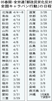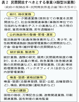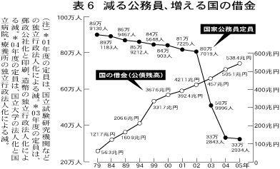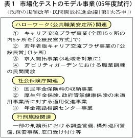 | ●“郵政民営化”突破口に公務大リストラ 1月21日の施政方針演説で小泉首相は、「官から民へ」の「改革の本丸」の位置づけで、郵政民営化法案の成立をめざす並々ならぬ意欲を表明しました。同時に年末の閣議決定(「今後の行政改革の方針(新行革大綱)」)にふれ、(1)独立行政法人22法人の再編、非公務員化、(2)05年度から5年間で10%の定員削減、(3)市場化テストの本格導入を強調しました。 郵政民営化を突破口に、聖域なしで公共業務の民間開放を強めようというのです。 ◇民間開放は企業のビジネスチャンス 日本経団連が昨年12月に公表した「経労委報告」を含め、財界は、民間開放が企業の新たなビジネスチャンスであることを隠そうともしていません。 進められる民間開放施策が、企業の新たなビジネスチャンスの創出(=企業による税金の分捕り)である点に、これまでの「行革攻撃」との違いがあります。 ◇給与制度改悪や定削と表裏一体 昨年末、政府の規制改革・民間開放推進会議は、4月以降の論議をとりまとめた「第1次答申」を公表しました。 その中で、民間開放策の目玉である「市場化テスト(官民競争入札)」の「モデル試行事業」として3事業(表1)と、本格実施に向けた検討対象の36事業を示しました(表2)。