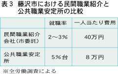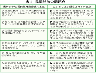 | ●専門性ある人材確保、良質のサービスが危機に 〜民間開放の3つの疑問〜 ◇民間化は効率的? Q 民間企業にまかせれば効率的だといいますが? A 民間経営がすべて効率的とは言えません。職業紹介の例では、神奈川・藤沢市が委託した民間企業による就職率は公共職業安定所の半分の2〜3%台、1人当たりの費用は公共職業安定所の8万円に対し、40万円にのぼると推計されています(表3参照)。利益を出すために、人件費を大幅に引き下げるリストラが当然とする風潮が広がっています。民間開放で、賃下げや雇用流動化が進み、専門性を持った人材確保ができなくなります(表4参照)。