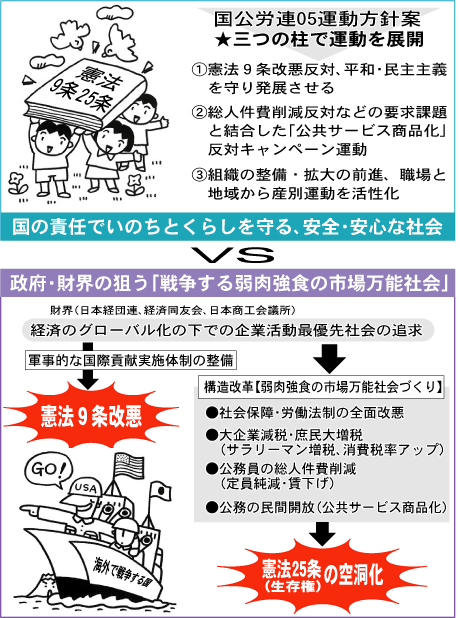 ●地域から共同ひろげ憲法が輝く社会を〜国公労連05年度運動方針案のポイント国公労連は、8月24日(水)から26日(金)まで、第51回定期大会を都内で開催します。大会に向けた運動方針案のポイントを小田川義和書記長に聞きました。 ◆ストップ!憲法9条改悪 〜国民を戦争に動員する役割は担わない −−2005年度の運動方針案では、三つの柱(1.憲法9条改悪反対、2.公共サービス商品化反対、3.組織整備・拡大)で運動を進めるとしていますが、最初に憲法課題を掲げているのはなぜでしょうか? ◇9条改憲は公務労働を変質させる 小田川書記長 昨年来の動きの中で、改憲の中心目的が、「日本の軍隊を海外派兵する」ことであることがはっきりしてきました。他の国と戦争する国に変えようとする動きに無関心ではいられません。 戦前の公務員は、「天皇の官吏」とされ、「お国のために命を捧げる臣民(国民)づくり」や戦争への国民動員が「仕事」でした。戦後、日本国憲法が制定され、「国民全体の奉仕者」となった公務員は、ナショナルミニマムの具体化など、国民共同の利益を追求する「労働者」に変わりました。 国公労連は、そのような歴史認識を今日まで継承してきました。他の国と戦争する日本に変わることは、公務労働の変質をともないます。国民を戦争に動員する役割を再び担わない、その決意で、「9条改憲反対」のたたかいを進めることを提案しています。 ◇大きく広がる「九条の会」 昨年6月に、「9条守れ」の一点での賛同と運動を呼びかけた「九条の会」のとりくみが、この1年間で大きく広がりました。地域や職場、様々な分野で結成された「○○九条の会」は全国で2000を突破し、さらに増え続けています。そして、それぞれがネットワークを形成しながら、「9条改悪反対」の世論を広げています。 国公労連も、この「九条の会」の運動の大きな流れに結集したとりくみを強めたいと思います。 ◇国民過半数署名・全職場学習の推進、職場9条の会結成を 国民過半数を目標とする「9条改悪反対署名」(06年末集約)を地域における憲法闘争の軸に置き、毎月9日を全国統一宣伝行動日とし、とりくみを進めます。 そのようなとりくみを効率的に、かつ全国的に進めるため、「全職場憲法学習運動」の強化、組合未加入者や管理職、職場に働く関連労働者の参加も得た「○○職場9条の会」や「○○県国公9条の会」の結成など、運動の基盤づくりをこの一年間重視することを提案しています。 ![]() ◆総人件費削減反対と結合し「公共サービス商品化」NO! −−公務員バッシングとともに、市場化テスト、民間開放、総人件費削減などの攻撃が強まっています。これに対してどう運動を進めていくのでしょうか? ◇行政民主化闘争で国民との共同を広げる 小田川 方針案では、柱の一つに「公共サービス商品化反対」の運動を位置づけています。 確かに現状では、公務の非効率が指摘され、マスコミも通じて、公務員の給与や働き方が連日のように批判されています。しかし、そのことと一体で、国民生活や公務の公共性を破壊する「構造改革路線」が進められていることや、サラリーマン大増税・消費税大増税の突破口として公務員バッシングが強められていることに、次第に国民の目がむきはじめています。郵政民営化法案をめぐる政治的混乱や、東京都議会選挙に、政府税調の「増税報告書」が影響を及ぼしたことなどがその実例です。 国民的な立場で、行政第一線の現状と問題点を明らかにし、政府の「骨太方針」など「構造改革」の矛盾や問題点を明らかにする行政民主化闘争を強めることが、公務員バッシングへの反撃にもなると考えています。 ◇産別一体で行政民主化署名を 具体的には、「国の責任でいのちとくらしを守り、安全・安心な社会の実現を求める署名」(仮称)を軸に、産別一体で、公共性破壊や公務員攻撃への反撃を強めることを提案しています。 行政研究活動の成果も活用しながら、「公共サービス商品化」反対キャンペーンのとりくみを強め、毎月第3水曜日を全国統一行動日とした宣伝行動や、地方議会要請行動、各種団体との行政懇談会など、できるとりくみを全国で展開することを呼びかけています。 こうした国民共同を広げる運動がなければ、強まる総人件費削減攻撃、賃金・労働条件の切り下げ攻撃に反撃できません。その点での組合員の意思統一と運動への参加を呼びかけます。 ◆組織の整備・拡大の前進、地域から産別運動のうねりを −−職場では、仕事が忙しくなっていて、「労働組合の活動が目に見えない」「メリットを感じない」という声も聞こえてきます。「数は力」が労働運動の原点だと思いますが、組織拡大・強化はどう進めていくのでしょうか? 小田川 これまでの運動の経過を見ても、運動の課題を学習し、職場討議を徹底して行い、全員参加の運動をめざした組織がとりくみの目標を達成し、要求も組織も前進していることが実証されています。 厳しい職場実