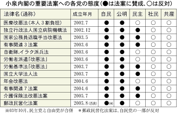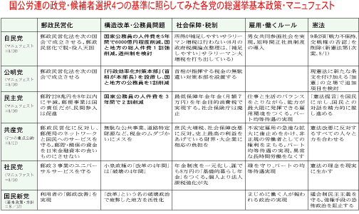 ●〈総選挙特集〉私と家族の明日を託して−−国公労連 政党・候補者選ぶ4つの基準−−8月30日公示、9月11日投票で総選挙が行われます。日本の進路を大きく左右する大事な国政選挙です。解散・総選挙にあたって、国公労連は、国公労働者とその家族の生活を守り、要求を実現するため、「政党・候補者選択の4つの基準」を発表しました。【1】郵政事業をはじめとした公務の民間開放に反対するのか 小泉首相が総選挙の「最大の争点」としているのが郵政民営化です。先の国会では「郵政民営化法案」は参院で否決され、廃案になっています。 今年6月に出された政府の「骨太方針2005」は、いっそうの民間開放や公務員の総人件費削減と、その先の社会保障費の抑制、大増税路線を描いています。 国公労連は、国民への公共サービスを守るために、民間開放と公務員減らしに反対するか否かを政党・候補者選択の基準とします。 【2】社会保障費抑制、サラリーマン大増税や消費税大増税に反対か 小泉内閣の4年4カ月は、国民・労働者に痛みを強いる「構造改革」の断行でした。医療や年金など社会保障制度の大改悪や増税の連続により、国民負担増は総額4兆5千億円にも上っています。 今年6月の政府税調は、「サラリーマン大増税」を大きく打ち出し、消費税大増税とあわせさらに大きな国民負担を負わせようとしています。 国公労連は、「構造改革」の本質である社会保障費抑制と弱いものいじめの大増税に反対するか否かを政党・候補者選択の基準とします。 【3】公務員やパートなどすべての労働者の生活・権利・雇用を守るのか 総務省統計によると小泉内閣の4年間で、勤労者世帯の月額ベースの実収入は、月額2万円以上も減っています。「賃金は安ければ安いほどいい」と正規労働者は300万人も減り、不安定な低賃金・使い捨ての非正規雇用が増大しています。 国公労連は、リストラ・人減らしに反対し、公務員をはじめ労働者の生活・権利・雇用を守る政策を持っているかどうかを政党・候補者選択の基準とします。 ![]() 【4】憲法改悪に反対し、平和と民主主義を守るのか 小泉内閣は、米軍のイラク攻撃を支持し、米軍が引き起こす戦争に国民を総動員する有事立法を制定してきました。そして、自民党は8月1日に、9条1項の「戦争放棄」の文言を削り、2項の「戦力不保持、交戦権の否認」を削除する9条全面改憲案を打ち出しました。格差拡大、弱者切り捨ての構造改革の断行は、国民の生存権を脅かす憲法25条の実質改悪とも言えます。 国公労連は、9条改悪や自衛隊の海外派兵・武力行使に反対し、憲法を政治に活かす政党・候補者であるかどうかを選択の基準とします。 ![]() ![]() *公務員の市民的・政治的規制はきわめて不当 政治活動・選挙活動の自由は、すべての国民に保障された憲法上の権利です。「言論・表現の自由」(21条)や「思想・良心の自由」(19条)とかかわり、基本的人権の中核です。公務員といえどもその例外におかれてはいません。現行法は公務員の政治活動を大きく規制していますが、これは国際的にも問題視されるきわめて不当なものです。 *できる活動は大いに そのような不当な制度下でも、人事院規則では「政治的行為の定義に含まれない限り…(国公法102条1に)違反するものでない」(人事院規則14-7の5項4)としています。例えば、「投票するよう勧誘運動をすること」も、「組織的、計画的又は継続的に勧誘」(人事院規則14-7の運用について)しない限り問題にならず、たまたま友人間での話し合いで支持をすすめることは該当しません。 ◆公示後でもできる活動のとりくみを (1)国公労新聞は、月3回以上発行の第3種郵便物なので選挙期間中の選挙報道及び論評は自由です(公選法第148条)。 国公労新聞の選挙特集号を使っておおいに職場討議をしましょう。 (2)支部や分会の機関紙でも、選挙に直接ふれなければ、通常行っている要求と政党・候補者とのかかわりを宣伝することはできます。 私たちの要求に各政党・候補者がどのような態度をとってきたのか、どのような政策を掲げているのかなど、労働組合の立場から職場に広げましょう。 (3)「サラリーマン増税反対」「9条改憲反対」など自らの要求にもとづく宣伝・署名行動などは、通常どおり実施できます。 (4)電話による投票の依頼は自由です。 公務員の「地位利用」にならない限り、電話での投票依頼は自由です。 (5)自筆の封書による投票依頼も自由にできます。 知人・友人や親戚など親しい人にあてた自筆の封書の中で、投票と応援は自由にできます。 (6)「個々面接」による投票の依頼も自由にできます。 知人・友人などにたまたま出会ったときや、他の要件で人を訪ねた際に、投票や応援を依頼することは自由です。 (7)演説会に参加し、政策への理解を深めましょう。 個人演説会や政談演説会などに参加することはもちろん、知人・友人を積極的誘うこともできます。 (8)後援会への加入やカンパへの協力も自由にできます