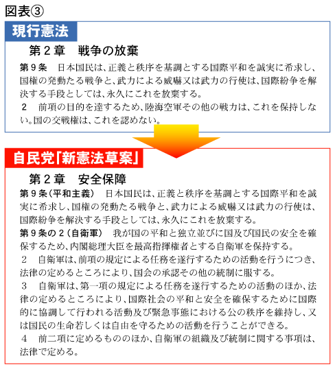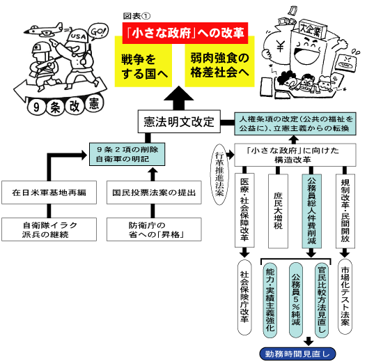 ◆ストップ!改憲・国民投票法案◇自民党が新憲法草案(改憲案)を決定自民党は、11月22日、結党50周年となる党大会で「新憲法草案」を決定しました。前文を全面的に書きかえ、戦争への反省をもとにした「政府の行為によって再び戦争の惨禍が起こることがないよう決意」とした文言や、戦力不保持を宣言した「9条2項」を削除し、あらたに「自衛軍」を憲法に明記(図表3)。軍事裁判所の設置もうたっています。 ![]() この改憲案に呼応するように、10月に行われた日米安全保障協議委員会の共同文書では、在日米軍基地の再編強化や自衛隊と米軍が一体となった海外での共同作戦実施を可能とする体制づくりに合意。改憲のねらいはいよいよ明らかです。 ◇改憲のための国民投票法案が国会に「新憲法草案」では、国会による憲法改正発議の要件を、現行の衆参両院での3分の2以上の賛成から、「各議員の総議員の過半数の賛成」に緩和。改憲を容易にするねらいです。国会には、国民投票法案を審議する憲法調査会が設置され、民主党が10月31日に、憲法9条2項を変える民主党憲法提言を行うなど、改憲の動きが強まっています。国民投票法案が当面の焦点になってきました。早ければ、06年通常国会で、成立がねらわれる危険性もあります。改憲反対の運動が緩めば一気呵成に、の状況です。 ◇前進する「9条守れ」の運動05年10月5日の毎日新聞世論調査では「憲法を改めることに」に賛成58%、反対34%ですが、9条改憲に絞れば、「変えるべき」に賛成30%、反対62%であり、20代での反対が70%と最も高くなっています。改憲のねらいを広く伝えることの必要性を示しています。04年6月に結成された「9条の会」は、全国の地域や職場で3200を超える会が結成され、保守層や宗教者なども参加する思想信条を超えた運動として広がっています。改憲を巡る状況からしても、このような職場・地域に根をはった運動がどれだけ広げられるか、今後の行方がかかる極めて重要な時期が06年春闘期です。 ◇全国の職場でこれだけはやろう