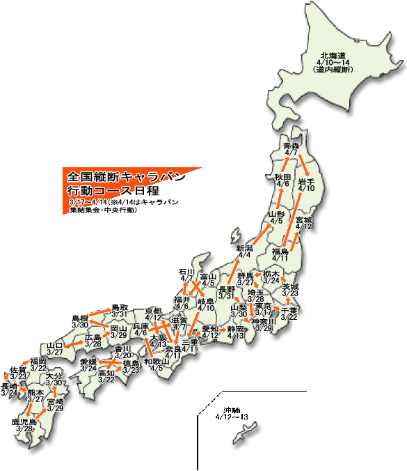 3月17日に東京をスタートする「全国縦断キャラバン行動」は、約1カ月かけて全国各地をかけめぐります(地図参照)。