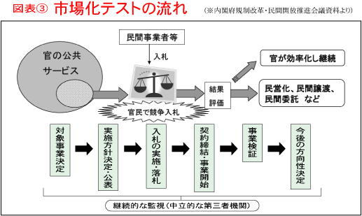 ◇実施部門に集中した5%以上の純減◇国民生活関連部門を狙い撃ち「行政改革の重点分野」として、(1)国民金融公庫、中小企業金融公庫などの統合を内容とする「政策金融改革」、(2)独立行政法人の「組織・業務の見直し」、(3)31の特別会計(図表2)の廃止・統合(一部は独立行政法人化の検討などと重複)、(4)「定員5%純減」などの総人件費改革、(5)宿舎などの国有財産の売却等、(6)公務員制度など関連制度の改革、の6点をあげています。これらの「分野」での「合理化」を集中的におこなうという「宣言」が「行政改革推進法案」の二つめの内容です。 ![]() 中心は総人件費改革です。国内総生産(GDP)比での「半減目標」をかかげ、「国家公務員・地方公務員の総数の純減と給与制度の見直し」と「独立行政法人・国立大学法人等での準じた措置」を求めています。 「国家公務員の純減」では、「5年間5%以上の純減」目標を掲げ、(1)農林水産省の統計・食料管理と北海道開発の事務の「減量」、(2)地方出先機関の統廃合・廃止(特に、公共事業担当部局や調査・統計など)、(3)職業紹介・指導、年金保険料の収納・相談、刑事施設の運営業務の民間開放(登記・特許・自動車登録事務なども同様)、(4)IT化による業務の簡素・効率化、(5)国有林野事業・国立高度専門医療センターの独法化(非公務員型、他の自立的な運営が可能な実施事務についても同様)としています(法42条〜50条)。 ここに列挙される事務・事業は「政府が実施する必要性が減少したもの」の代表格だとし、集中的な「純減計画の具体化」を迫っているのです。 一部の事務・事業に集中した「純減」を求めていることとの関係で、「府省横断的な配置の転換及び職員の研修を行う仕組み」と「職員の採用抑制」の措置を講ずることも明らかにしています。 ◇定員純減と賃下げ(独法等にも強制) 国家公務員の給与については、給与体系と官民賃金比較方法についての人事院の検討をふまえた「必要な措置」を2006年度以降、具体化するとしています。 これらに加え、(1)独立行政法人の非公務員化、(2)独立行政法人・国立大学法人・特殊法人での「5%人件費削減」、(3)公立学校教職員をはじめとする地方公務員の「4.6%以上の純減」、(4)国に準じた地方公務員給与の「見直し」や教育職員の人材確保法の見直し、などを規定しています。国家公務員の純減と賃金引き下げを突破口に、国の「力と施策」を動員して、公務関連分野のリストラを進めようというのです。地方自治も、独法の自主的運営も、「構造改革」の前には存在していないようです。 また、総人件費改革などとかかわる「関連制度」として、公務員制度改革にもふれ、「国家公務員の給与制度見直し」の状況もふまえた「公務員の労働基本権及び人事院勧告制度などの検討」に言及しました。「リストラとバーターでの労働基本権回復」の危険性はありますが、「労働基本権の制約現状維持」としていたこれまでの政府答弁を変更する内容です。 さらに、出入国管理、社会保障、労働分野などでの規制改革、「市場化テスト」の本格実施、政策評価の推進、などにも言及しています。 ◇あらたな“行革推進体制”も設置 「行政改革」を「総合的、集中的」に実施するため、内閣総理大臣を本部長に、各府省大臣などを構成メンバーに、5年間の期間限定で設置される「行政改革推進本部」を内閣に設置することも条文に掲げています。政治主導の「行革」を印象づけるためです。 ◇市場化テストで聖域なしの民間開放◇すべての公共サービスが市場化テストの対象「行政改革推進法案」でも関連制度に位置づけられた「市場化テスト法案(競争の導入による公共サービスの改革に関する法律案)」は、2月10日に国会に上程されています。 法案は、図表3のように取りまとめられる「市場化テストの流れ」について、手続等をさだめるものです。ですから、内容は、極めて具体的です。 ![]() 「市場化テスト」の対象となる業務は、「国の行政機関」と独立行政法人、国立大学法人、特殊法人が実施する「公共サービス」(行政処分を除く)のすべて(代表的なものとして、施設の設置、運営や相談の業務などを例示)と、法律の特例を設けて民間企業の参入を認める「特定公共サービス」(たとえば、社会保険庁の年金収納事務や地方自治体での窓口業務など)の「二種類」が規定されています。 「公共サービス」として「市場化テスト」の対象から除外された「行政処分をともなう事務」も、「特定公共サービス」として対象に加えることができる、という仕組みです。「市場化テスト法案」が「聖域なしの民間開放の仕組み」とされるのはこの点からです。 ◇民間事業者等の「要望」をもとに「手続き」を開始 「市場化テスト」は、国の行政機関等と民間事業者が競う「官民競争入札」と、民間事業者同士が競う「民間競争入札」の二種類が規定されています。実際にどちらの競争入札をおこなうのかは、内閣総理大臣が、民間事業