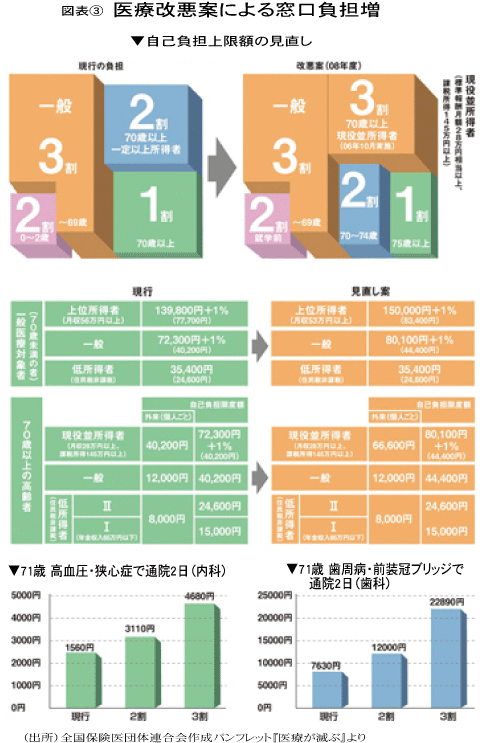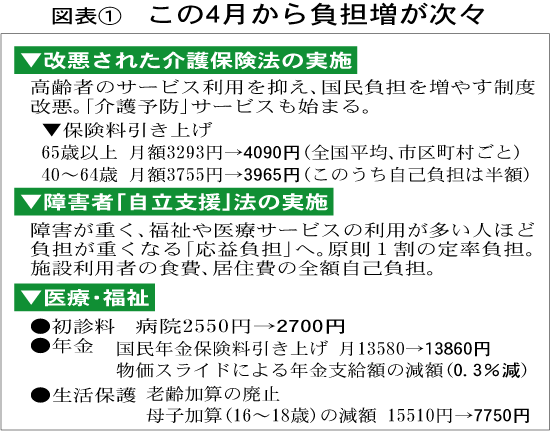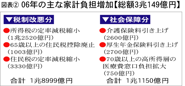 ◆とどまらない高齢者いじめ「小さな政府」がもたらすものは…4月1日から、暮らしにかかわる制度のいくつかが変わりました(図表1)。介護保険料は800円も増額され、障害者「自立支援」法では、障害が重くサービス利用が多い人ほど負担が重くなる「応益負担」に変わりました。病院の初診料、国民年金保険料もアップし、生活保護の「母子加算」は半減されました。毎年のように繰り返される小泉「構造改革」の国民いじめのあらわれです。社会保障給付の削減を目的にした制度の連続改悪の悪影響が、高齢者に集中してきています。 ![]() ◆連続する高齢者の暮らし破壊 年金・医療・介護など社会保障の改悪が連続し、生活保護、障害者福祉など最低限の生活を支える制度まで、予算削減の対象にされ始めています。 02年の医療改悪では、サラリーマン本人の医療費負担を3割にする改悪と同時に、高齢者の1割負担が徹底されました。 04年には、年金保険料の引き上げを2017年度まで続ける一方で、年金の給付額は毎年0.9%抑制する年金改悪がおこなわれています。 97年に成立した介護保険制度では、それまで国の福祉制度であった高齢者介護を、保険料を払わなければ利用できない「保険制度」に改変するとともに、実施責任を市町村に丸投げ。その結果、保険料・利用料負担が高齢者の生活と市町村財政を圧迫し、地域間の格差を拡大する要因になっています。 05年からは、減り続ける年金から所得税が徴収されることになり、05、06年に強行された定率減税の廃止が追い打ちをかけています。小泉「構造改革」は高齢者いじめの政治、「小さな政府」は高齢者を疎外する政府、というのが実態です。 ◇襲い続ける負担増 92年3月5日の衆院予算委員会で、渡辺美智雄大蔵大臣(当時)は、高齢者医療は「枯れ木に水を注ぐようなもの」と答弁。これは、いまに続く「構造改革」の基本的な認識でしょう。競争原理を「最善」とし、働く場から「排除」された国民は「負け組」とされ、自己責任を迫ろうとする動きは加速しています。 06年度予算は、高齢化の進展による社会保障関係費の自然増分(8000億円)を圧縮する方針のもと編成され、伸びを1931億円にまで抑制するため、高齢者の医療費負担増などの医療改悪がとりまとめられました。生活保護の国庫負担金は「三位一体改革」の口実で4分の3から3分の2に引き下げられています。 06年は高齢者・国民を多くの負担増が襲います。1月には所得税の定率減税半減、4月には介護保険料引き上げ、生活保護の老齢加算廃止、国民年金保険料引き上げ、6月には住民税の定率減税半減、高齢者非課税限度額廃止、公的年金等控除縮小、老年者控除廃止、9月には厚生・共済年金保険料引き上げ、そして10月には医療制度大改悪。とどまるところを知りません(図表2)。昨年10月から介護保険利用者の食費・居住費が全額自己負担になった影響で「一気に7万円も負担が増えた」、老年者控除廃止、定率減税の半減などで「年間10万円近くの負担増になる」、「本当に長生きしていいのか」―高齢者の生活に対する不安は深刻です。 ![]() ◆医療改悪で「所得の格差」が「命の格差」に 小泉内閣は、通常国会に医療制度の大改悪法案を提出し、成立を狙っています(図表3)。公的医療制度の土台を崩す大改悪を許せば、お金の払えない人は公的医療から排除され「所得の格差」が「命の格差」に直結する社会となってしまいます。 ![]() ◇高齢者負担が一気に3倍も 改悪案の中で重大なのが高齢者の負担増です。これは、(1)70歳から74歳の一般所得者、低所得者の窓口負担を1割から2割に引き上げる、(2)70歳以上の現役並所得者(標準報酬月額28万円以上、課税所得145万円以上)は、窓口負担を2割から3割に引き上げる、(3)患者自己負担の上限を引き上げる、というのが大きな柱です。 例えば71歳で高血圧と狭心症の場合、1560円から3110円へ、仮に「現役並」所得に区分されれば、4680円へと一気に3倍の負担を強いられます。 ◇入院患者に過酷な仕打ち 入院の場合は、いっそう深刻です。改悪案は病院の平均在院日数を短縮することを提起。加えて「介護保険との均衡」を口実に、療養病床に入院する高齢者の居住費や食費の患者負担を打ち出しています。これが実施されると、70歳以上で現行より月額3万2000円、年間38万4000円もの負担増となります。すでに実施された介護施設では、高齢者が退所を余儀なくされる事態が全国で広がっています。病院で同様のことが起これば、命にかかわる重大な事態です。 ◇保険がきかない治療拡大 改悪案は、保険がきく診療と保険がきかない診療を組み合わせる「混合診療」を本格的に拡大する方向を明記しました。「保険証1枚あれば、必要な医療はすべて受けられる」のが日本の医療制度です。この間も、人工透析、眼内レンズ、臓器移植など、最初は保険のきかない高額の医療が、保険の中に組み込まれてきたのは、この「国民皆保険」の考え方があったからです。 今回の改悪案