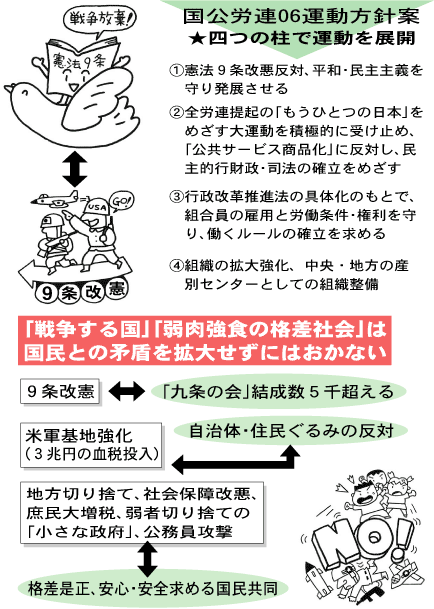 ◆格差拡大、戦争する国NO!憲法が輝く社会を〈国公労連06年度運動方針案のポイント 国公労連は、8月31日(木)から9月2日(土)まで、第52回定期大会を都内で開催します。大会に向けた運動方針案のポイントについて、ちひろと健太が語り合いました。 ◆ストップ!憲法9条改悪 国民投票法案、教育基本法案の廃案を 健太 国公労連の06年度運動方針案が出たね。 ちひろ 職場で大いに討議して、深めていきたいね。 健太 方針案のポイントはどこかな? ちひろ 四つの重視する運動課題を提起しているわ(下表参照)。 ![]() ちひろ 最初が憲法課題よ。 健太 僕たち国家公務員にとって、他の国と戦争する日本に変わることは、重大な仕事の変質をともなうよね。 ちひろ そうね。国民を戦争に動員する役割は絶対にしたくないわ。 健太 9月下旬から12月上旬といわれてる臨時国会では、9条改憲のための国民投票法案をはじめ、教育基本法改悪法案や米軍基地再編・強化の費用支出のための法案が重要な段階になるって言われているね。 ちひろ 職場・地域からのとりくみがいよいよ大切だわ。 健太 方針案では具体的にどんな運動を提案してるのかな? ちひろ 9条改憲反対の署名運動を継続しながら、8月から国民投票法案と教育基本法案に反対する署名をスタートさせるの。9月から展開する教育基本法改悪反対の全国キャラバン行動の成功に向けて、積極的な役割を発揮するとしているわ。 ◇11.9全国一斉憲法宣伝行動を全県で具体化 健太 毎月の「9の日」の宣伝行動は継続して職場・地域からとりくむんだね。 ちひろ とくに、憲法公布から60年目になる11月のとりくみを重視して、11月9日を全国一斉憲法宣伝行動日と位置づけ、全県の県庁所在地で終日の宣伝行動の具体化を提起しているわ。 健太 全労連は07年7月までにすべての職場に「九条の会」を結成しようと呼びかけてるね。 ちひろ 国公労連としても職場・地域(県・地区国公)に「九条の会」の結成を急ごうと提案してるよ。 ◇すべての仲間の参加で新聞意見広告運動を 健太 目を引くのは「新聞意見広告運動」だね。 ちひろ 国民投票法案などが重要局面となる秋の臨時国会にあわせて「九条の会」の主張を国民に紹介する「新聞意見広告運動」を国公労連独自のとりくみとして具体化したいとしているね。 健太 かかる費用については、職場のすべての仲間と家族にカンパを訴えることとして、9月から10月の2カ月間でとりくもうと提案しているよ。 ちひろ わが家も家族みんなで参加したいわ。 ◆「もうひとつの日本」めざす大運動で公共サービス商品化はねかえそう ◇「もうひとつの日本」めざす大運動に結集 健太 全労連は、「もうひとつの日本」をめざす大運動を提起しているね。 ちひろ それを国公労連は積極的に受けとめて、「公共サービス商品化」反対、民主的行財政・司法の確立をめざすとりくみを強めるの。 健太 全労連が提起している秋の「網の目総行動」、国会請願署名、地方自治体要請行動などの成功に積極的な役割を果たすんだね。 ちひろ そして、春闘期、3月の地方議会に向けたとりくみとして、3回目となる「公共サービス商品化・地方切り捨て反対」の意見書採択運動にとりくむ。 健太 引き続き毎月第3水曜日の宣伝行動の定着を全組織で追求して、秋闘期と春闘期に「小さな政府・国公労連統一宣伝行動日」を設け、各種団体要請等も含めた集中した行動を展開するね。 ◇行政研究集会の成功を ちひろ 11月17日には、国公労連第2回行政研究集会を開催するわ。その成功をふまえて、ブロック国公規模での「小さな政府反対決起集会」を2月から5月頃のとりくみとして提起してる。それに年間を通じて「行政何でも相談」や行政懇談会の開催を全県国公で追求するよ。 健太 07年通常国会で大きな争点になると言われてる庶民大増税と社会保障改悪、雇用の流動化を加速する労働法制改悪、の三つの課題を「構造改革」に反対する中心課題にあげているけど、具体的なとりくみはどうなるのかな? ◇「税金3年闘争」を開始 ちひろ 大増税に反対するとりくみとしては、消費税の税率アップが狙われてる2009年度に向け、「税金3年闘争」をスタートさせるわ。 健太 初年度となる06年度は何をするんだろう? ちひろ 職場と職場周辺の労働者・家族を対象に、「税を知り、払いすぎた税金を取り戻すとりくみ」(仮称)を提起。年末調整がおこなわれる12月に職場での税金パンフレットの活用を呼びかけるとともに、1月から3月にかけた確定申告期にもその活用を呼びかけ、「税を知る学習活動」にとりくむの。 ◇労働法制改悪反対学習決起集会を全ブロックで 健太 労働法制改悪については? ちひろ 全労連などに結集した署名行動と、国公労連独自のとりくみとして、11月から2月にかけて労働法制改悪反対学習決起集会を全ブロックで開くのよ。 ◇「社会保険庁改革対策委員会」を設置 健太 総人件費削減や民間開放で、公務労働者の雇用・労働条件への攻撃が強まっているね